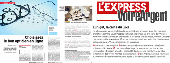 Ce mois ci, le magazine l'EXPRESS, MIEUX VIVRE VOTRE ARGENT dédie un de ses articles aux opticiens en ligne et présente un guide pour choisir parmi les sites les plus intéressants du web. Lunigal reçoit la palme du site le plus "LUXE" avec une sélection pointue de montures haut de gamme.